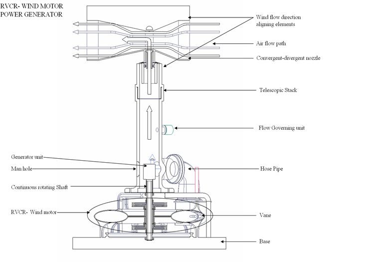 RVCR is the 1st in basing a FLUID motor on a rotary positive displacement mechanism. The RVCR system deploys a Convergent divergent nozzle in the flow path of air rather than a turbine. This creates low pressure at throat of the Nozzle. An air stack connects the low pressure at nozzle throat to the RVCR wind motor exhaust.